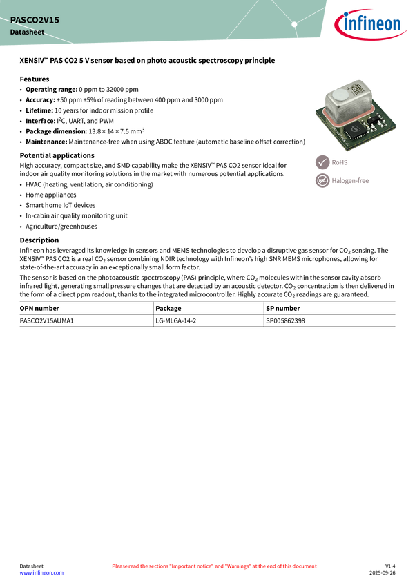 XENSIV™ PAS CO2 5V gas sensor The XENSIV™ PASCO2V15 gas sensor is a 5V, real carbon dioxide (CO2) sensor based on photoacoustic spectroscopy (PAS) technology. The sensor comes in an unprecedentedly small form factor and provides accurate CO2 data outputs in direct ppm readings. Its direct ppm readings, Tape and Reel packing, SMD capability, and simple design allow for quicker and easier integration into customers' systems in both low- and high-volume applications. The compact design facilitates seamless in