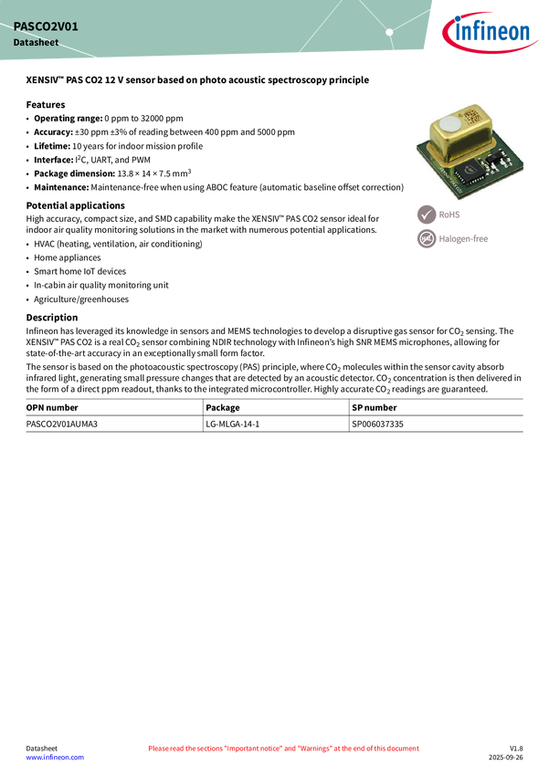 XENSIV™ PAS CO2 12V gas sensor The XENSIV™ PASCO2V01 gas sensor is a 12V, real carbon dioxide (CO2) sensor based on photoacoustic spectroscopy (PAS) technology. The sensor comes in an unprecedentedly small form factor and provides accurate CO2 data outputs in direct ppm readings. Its direct ppm readings, Tape and Reel packing, SMD capability, and simple design allow for quicker and easier integration into customers' systems in both low- and high-volume applications. The compact design facilitates seamless