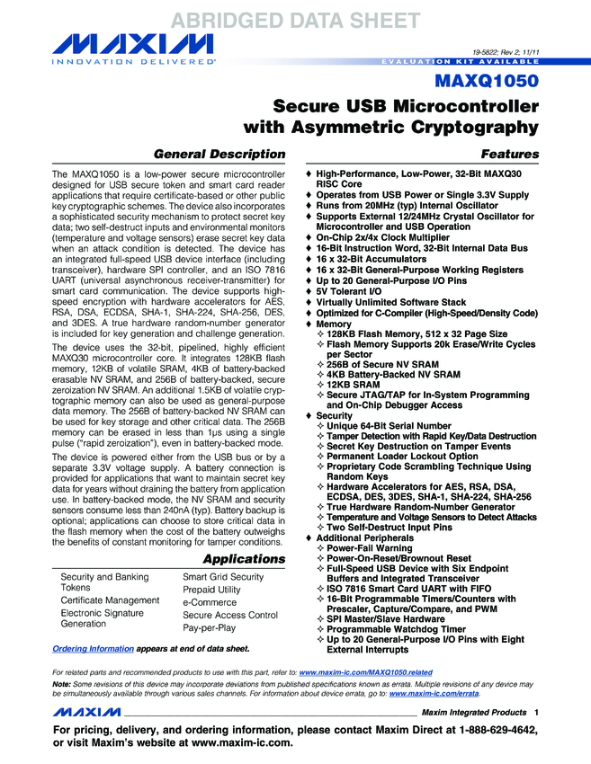 MAXQ1010, MAXQ1011, MAXQ1012 DeepCover Secure Microcontroller for Security Tokens with RTC and USB