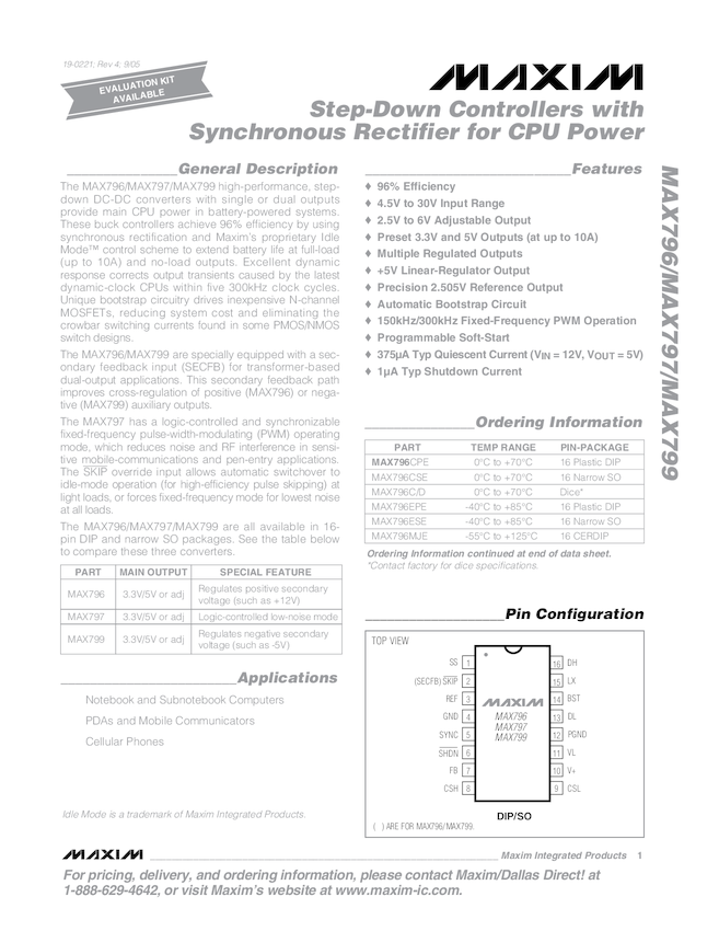 MAX799 Step-Down, PWM Controller with Synchronous Rectifier for CPU Power with Negative Secondary