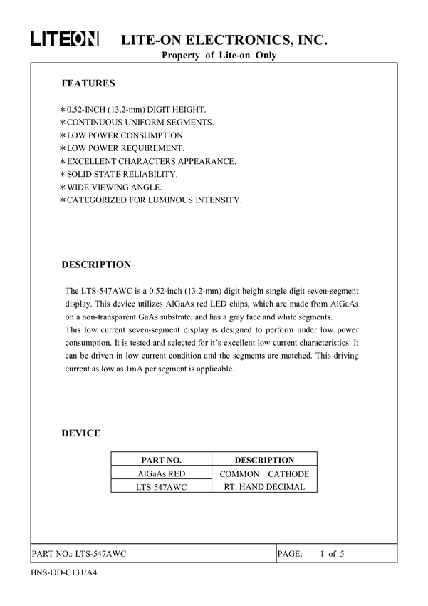 Wyświetlacz; LTS547AP; LED; pojedynczy; czerwony; 7-segmentowy; 13mm; 12,2mm; 17,5mm; kolor tła: szary; 800mcd; 2,1V; 20mA; katoda; zasilanie: 3-8 noga; 657nm; LITEON;RoHS