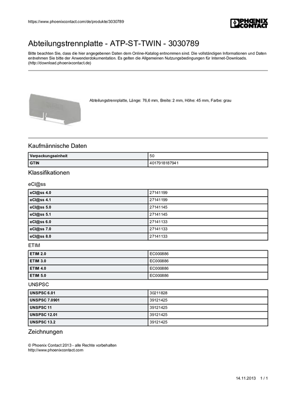 Przegroda rozdzielająca sekcje Phoenix Contact ATP-ST-TWIN 3030789, 1 szt.