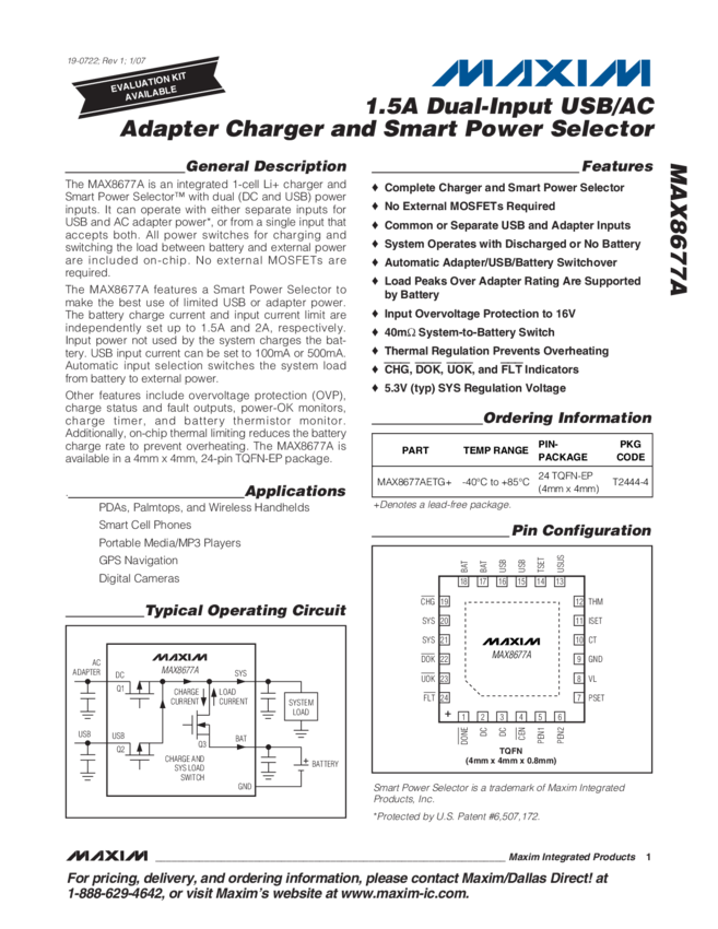 MAX8677A 1.5A Dual-Input, USB/AC Adapter Charger and Smart Power Selector