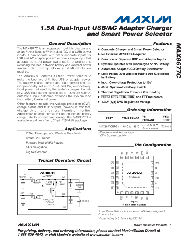 MAX8677C 1.5A Dual-Input, USB/AC Adapter Charger and Smart Power Selector