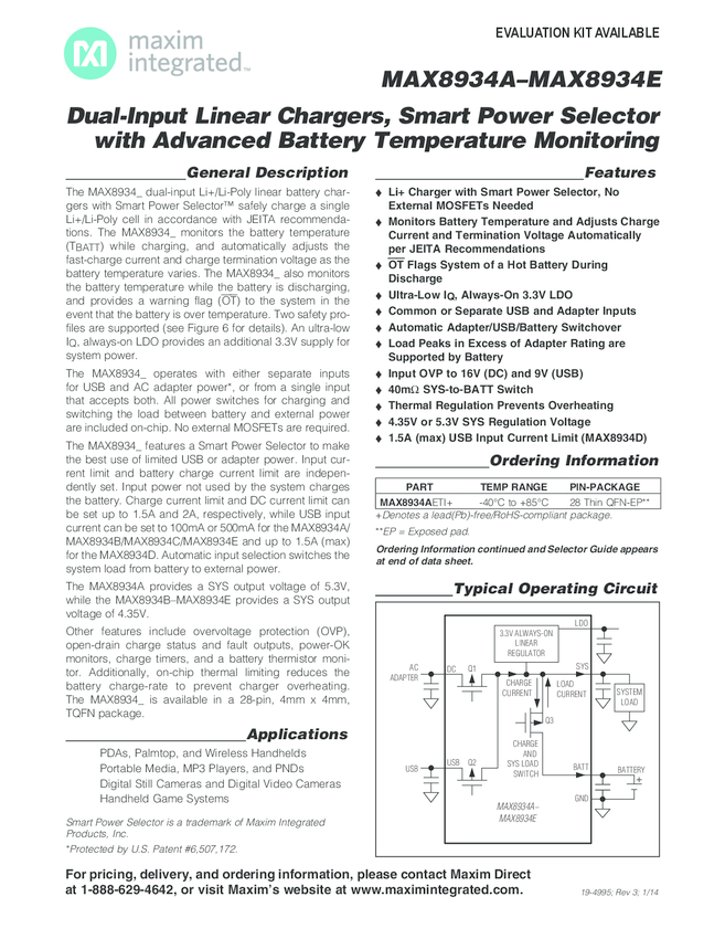 MAX8934E Dual-Input Linear Chargers, Smart Power Selector with Advanced Battery Temperature Monitoring