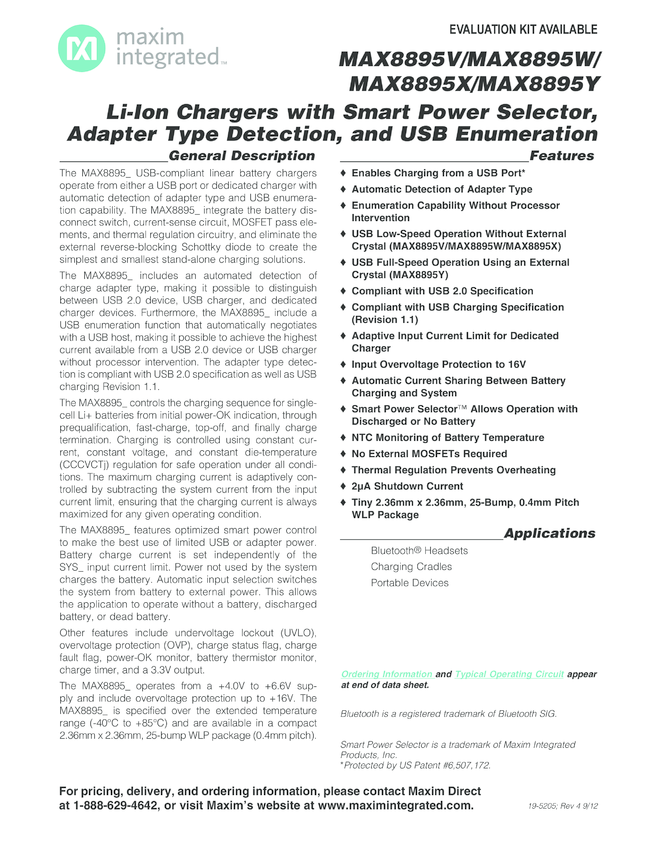 MAX8895V, MAX8895W, MAX8895X, MAX8895Y Li-Ion Chargers with Smart Power Selector, Adapter Type Detection, and USB Enumeration