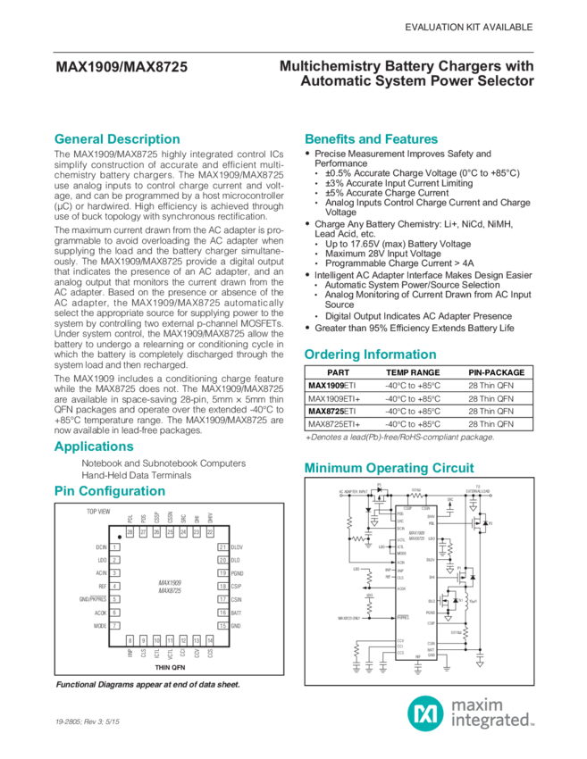 MAX1909, MAX8725 Multichemistry Battery Chargers with Automatic System Power Selector