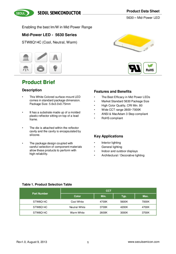 Dioda LED; E2-STW8Q14D; SMD; 5630; biała; 4000K; biały; 31,2lm; 2,7-2,8V; 65mA; 120*; Seoul Semiconductor; S1W0-5630XX8003-00000000-00004; RoHS; opakowanie/100szt