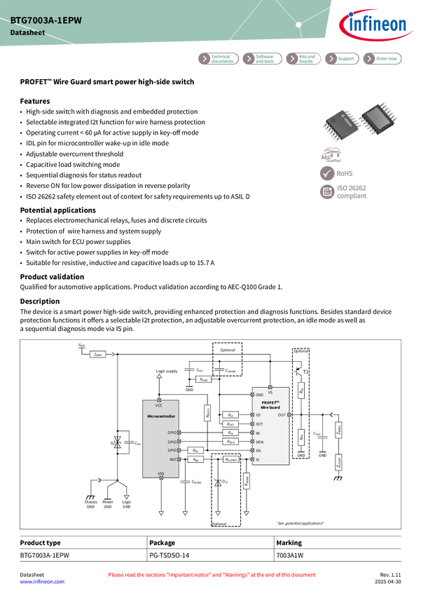 12 V | 3.6 mΩ | 15.7 A | integrated I²t wire protection| automatic Idle mode | 1 channel smart high-side power switch | analog current sense, sequential diagnosis | PG-TSDSO-14 | ISO 26262-compliant | PROFET™ Wire Guard 12V The single-channel high-side power switch BTG7003A-1EPW, member of the PROFET™ Wire Guard family, is designed for wire protection in modern automotive E/E architectures. It is equipped with integrated I²t wire protection, and enhanced diagnostic capabilities. Its adjustable overcurrent
