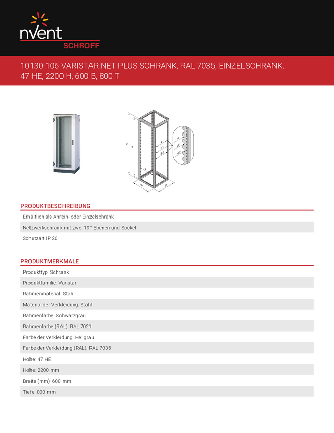 nVent SCHROFF 10130113 Obudowa pusta szafy sieciowej/serwerowej 800 x 2200 x 600 szaro-biały (ral 7035) 1 szt.
