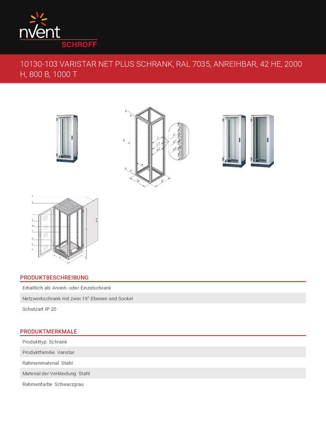 nVent SCHROFF 10130103 Obudowa pusta szafy sieciowej/serwerowej 800 x 2000 x 1000 szaro-biały (ral 7035) 1 szt.