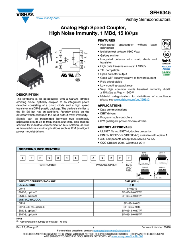 Analog High Speed Coupler, High Noise Immunity, 1 MBd, 15 kV/µs