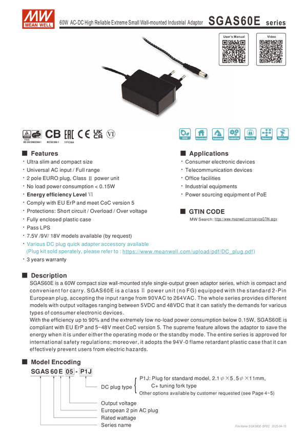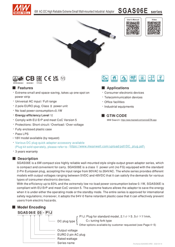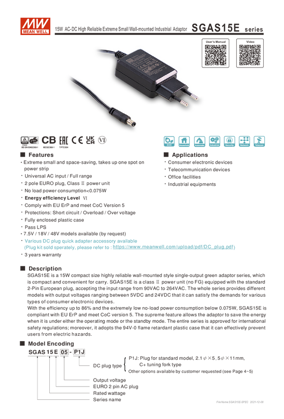 Zasilacz wtyczkowy, stałonapięciowy MW Mean Well 1 A 5 W