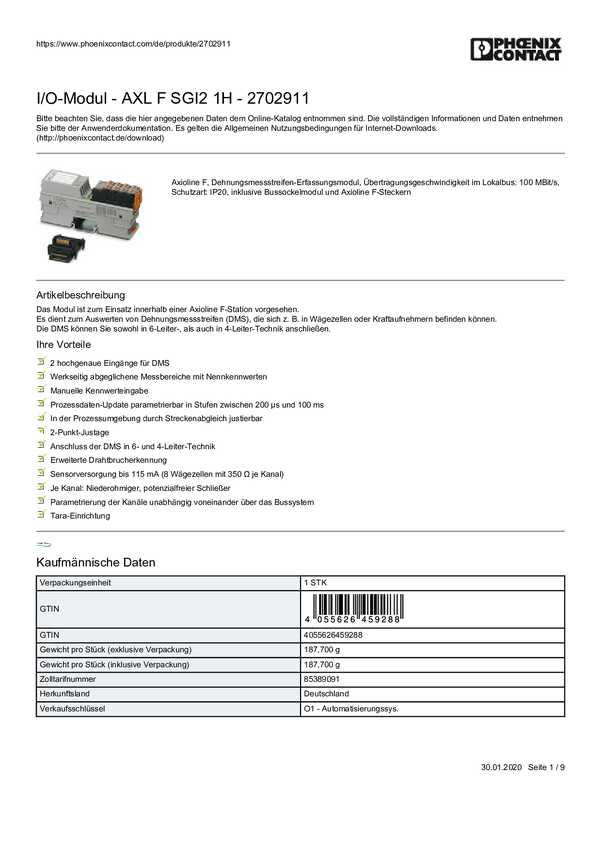 Phoenix Contact AXL F SGI2 1H 2702911 Moduł I/O 5 V/DC