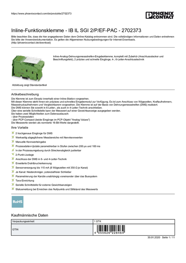Phoenix Contact IB IL SGI 2/P/EF-PAC 2702373 Zacisk funkcyjny 7.5 V/DC