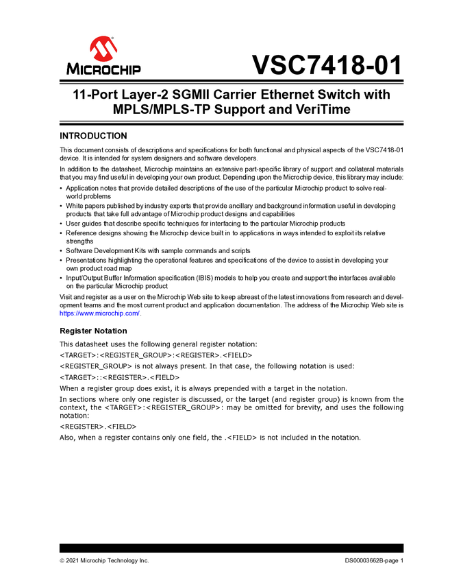 VSC7418-01 11-Port Layer-2 SGMII Carrier Ethernet Switch Datasheet
