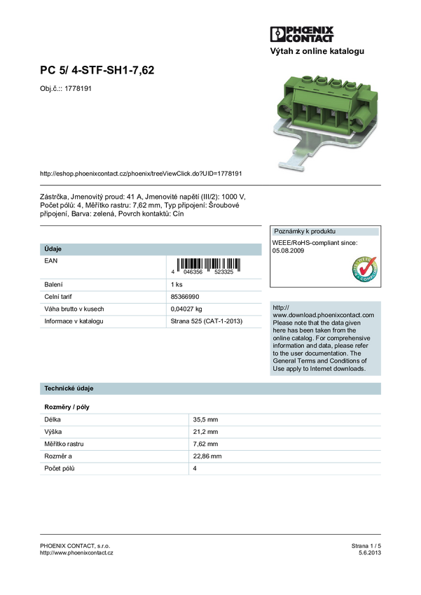 Phoenix Contact 1778191 Obudowa złącza pin żeńskiego na kabel PC 5/ 4-STF-SH1-7,62, wire-to-board, piny: 4, 41 A, 50 szt