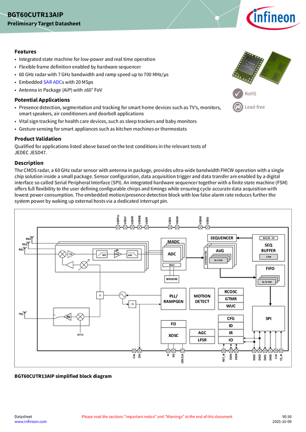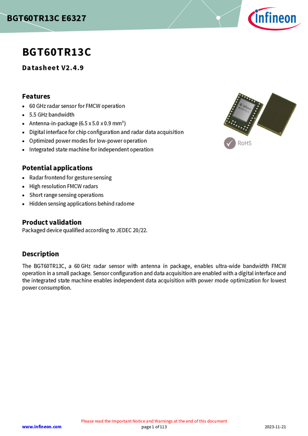 XENSIV™ 60GHz radar sensor for advanced sensing The BGT60TR13C is a 60 GHz radar sensor with Antennas in Package (AIP) in an L-shaped array. Its built-in Finite-State Machine (FSM) manages FMCW frequency sweeps, data acquisition, and sample storage into the internal FIFO memory, while optimized power modes and DC duty cycling minimize power consumption. The sensor is configured and controlled via a standard SPI interface, allowing for easy integration into various applications.