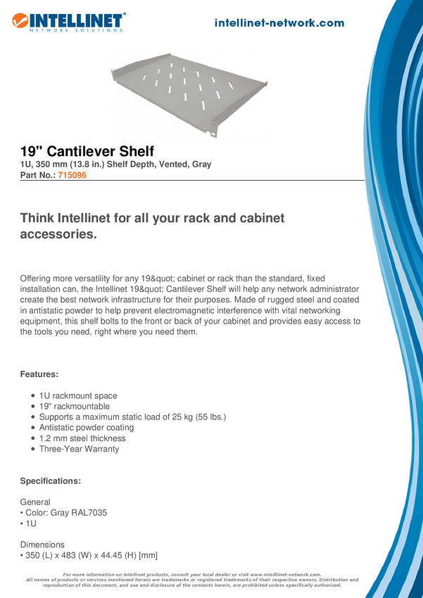 Półka na urządzenia Intellinet Intellinet 715096 porta accessori Mensola per scaffale (19IN CANTILEVER SHELF 1U 715096 1
