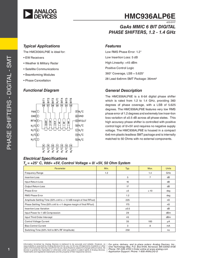 GaAS MMIC 6 Bit Digital Phase Shifters, 1.2 - 1.4 GHz