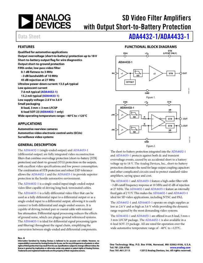 ADA4433-1: Fully Differential SD Video Filter Amplifier with Output Short-to-Battery Protection
