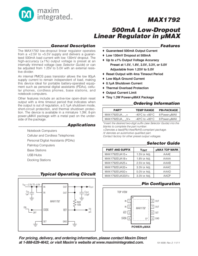 MAX1792 500mA Low-Dropout Linear Regulator in &#181MAX, Short-Circuit and Thermal Protected