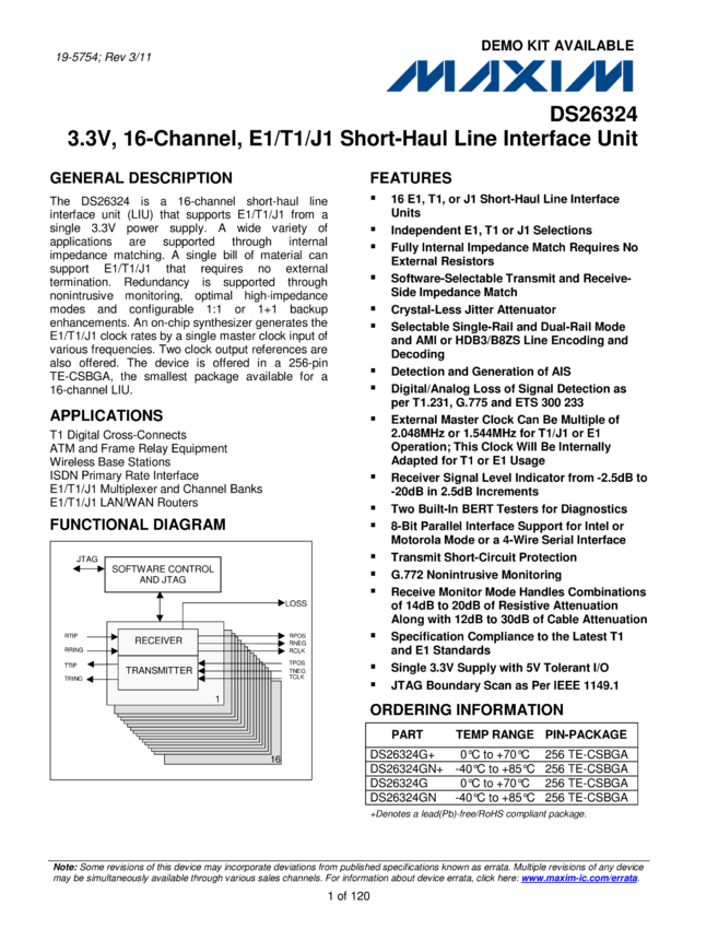 DS26324 3.3V, 16-Channel, E1/T1/J1 Short-Haul Line Interface Unit