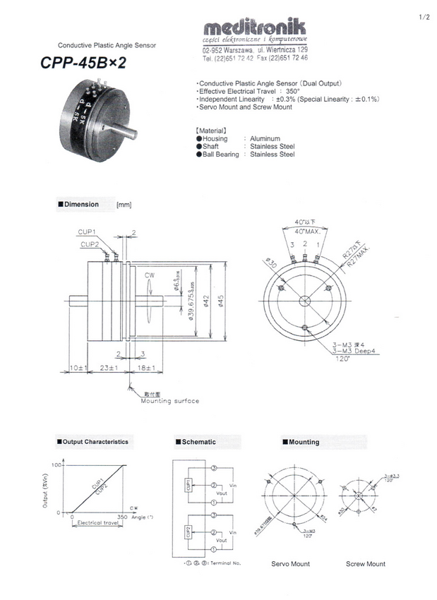 Precision Angular Position Transmitter PW70-F Kąt pracy mechaniczny 350 stopni ze stopami, Kąt pracy elektryczny: 42 stopnie shorted; 98 stopni 1400 ohm +-1%; 70 stopni shorted; 83 stopnie 1185,7 ohm +-1%; 57 stopnie shorted; Potencjometr 4 końcówkowy z Center Tapem ośka 6 nn 13,5 mm długa; średnica korpusu 70mm; gł. 27,4mm; od frontu M4 rozstaw 50mm Dla wersji standard Tolerancja rezystancji 2%; Liniowość standard +-0,15% moc 6W; wersja specjalna może mieć inne parametry łożysko sintered bearning