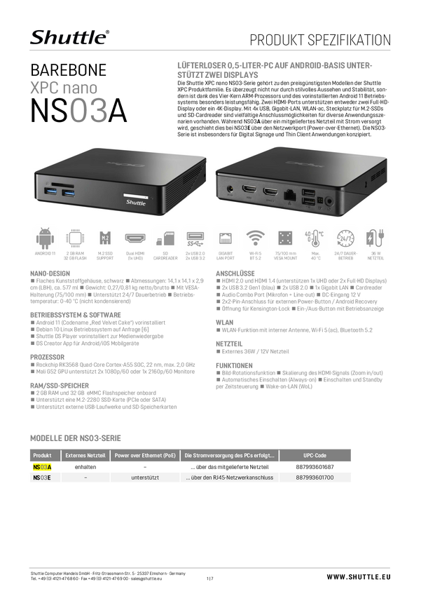 Shuttle Stacja robocza Mini PC NS03A Rockchip RK3568 2 GHz NS03A