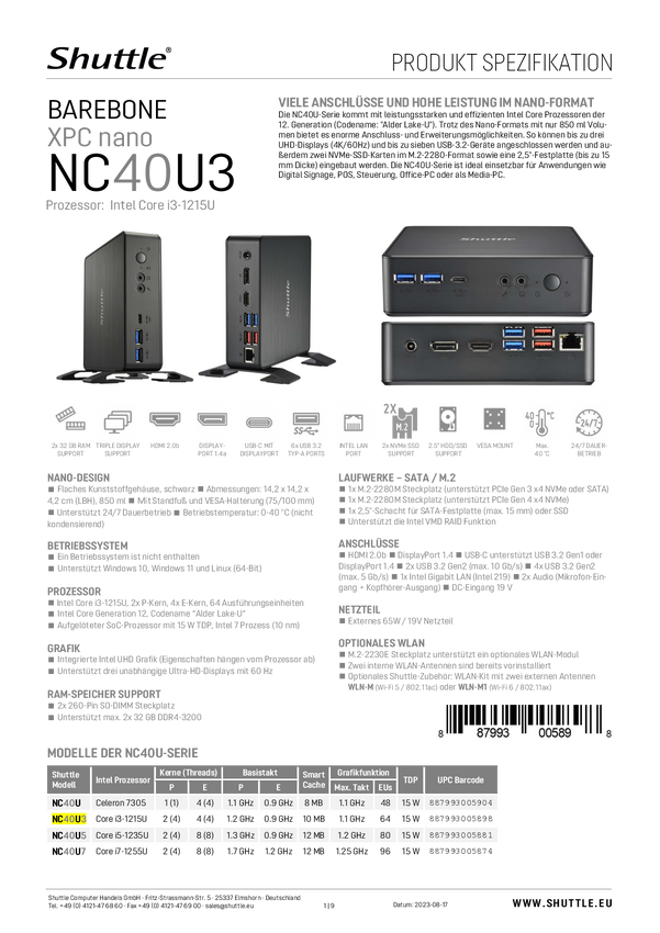 Shuttle Barebone NC40U3 Intel® Core™ i3 i3-1215U Intel Grafika UHD FreeDOS NC40U3