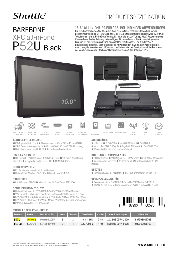 Shuttle Barebone P52U 39.6 cm (15.6 cal) Full HD Intel® Celeron® 5205U 1.9 GHz Intel Grafika UHD FreeDOS P52U
