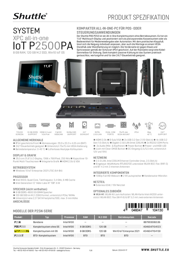Shuttle All-in-One PC IOT P2500PA 29.5 cm (11.6 cal) HD Intel® Pentium® N100 3.4 GHz 120 GB SSD POS P250