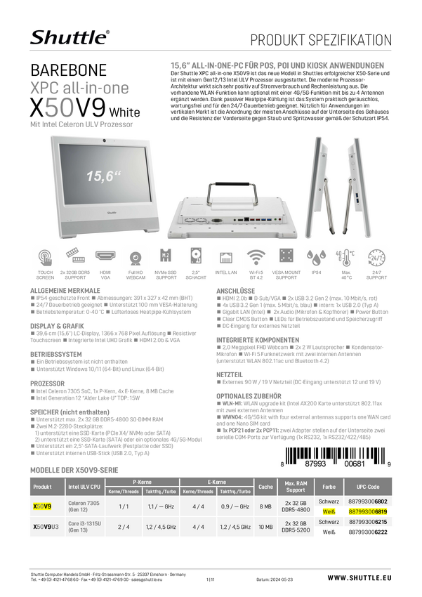 Shuttle All-in-One Barebone X50V9 WHITE 39.6 cm (15.6 cal) HD Intel® Celeron® 7305 Intel X50V9 (BLACK)