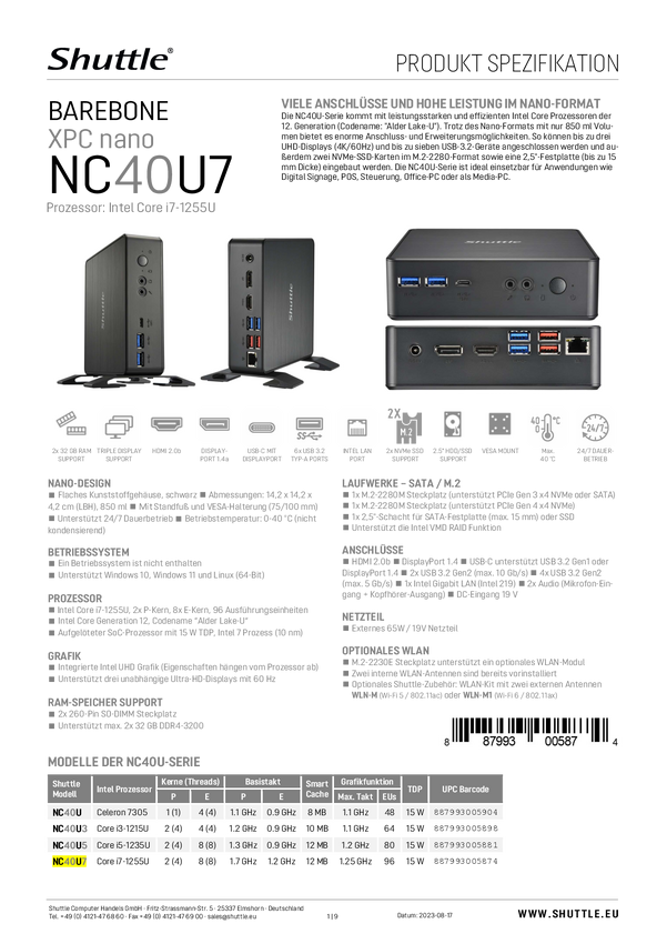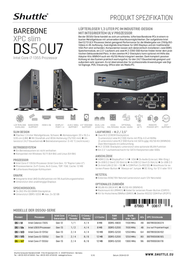Shuttle Barebone DS50U7 Intel® Core™ i7 i7-1355U 5 GHz Intel FreeDOS DS50U7