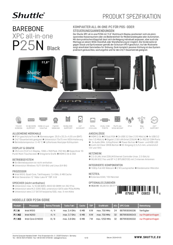 Shuttle All-in-One Barebone P25N 29.5 cm (11.6 cal) HD N100 3.4 GHz Intel FreeDOS P25N