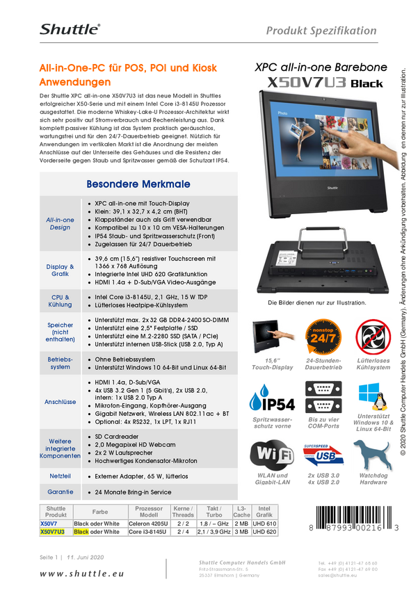 Shuttle All-in-One PC X50V7U3 39.6 cm (15.6 cal) Intel® Core™ i3 i3-8145U 3.9 GHz Intel Grafika UHD PAB-X50V7U311