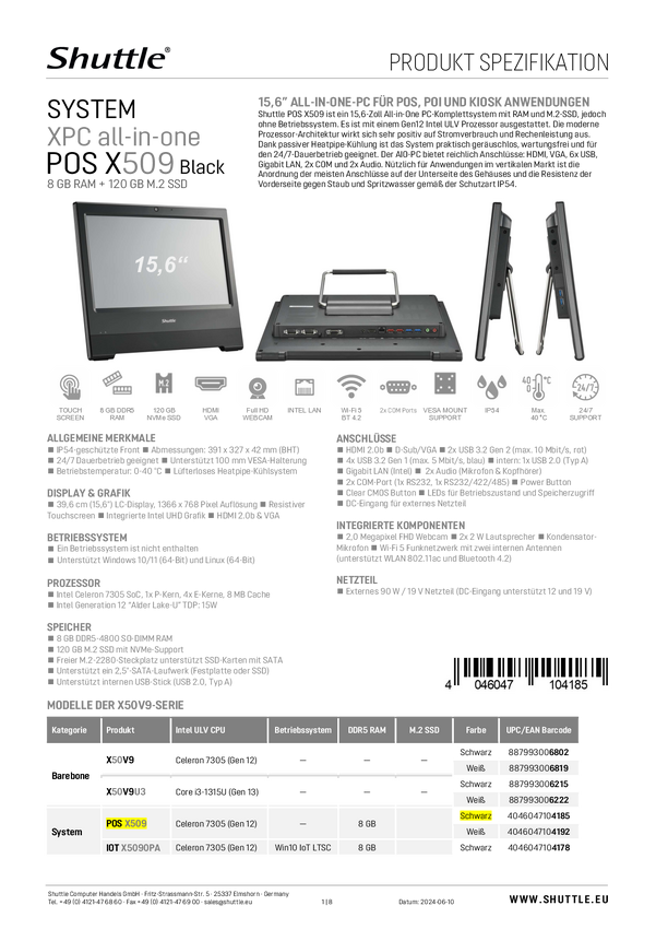 Shuttle All-in-One PC POS X509 BLACK 39.6 cm (15.6 cal) HD Intel® Celeron® 7305 120 GB SSD FreeDOS POS X509 (BLACK)