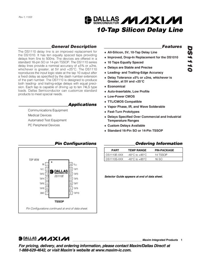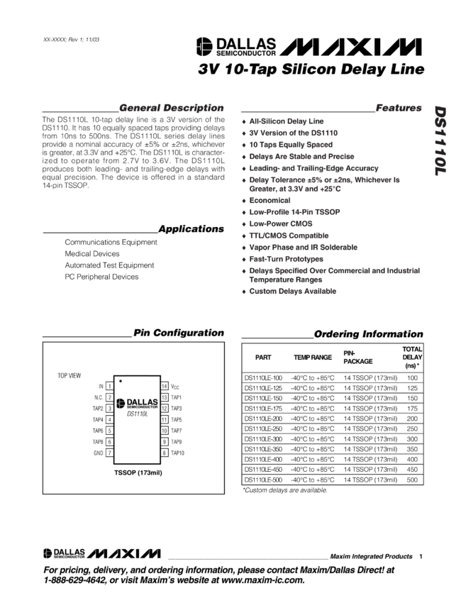 DS1110L, DS1110LE-100, DS1110LE-125, DS1110LE-150, DS1110LE-175, DS1110LE-200, DS1110LE-250, DS1110LE-300, DS1110LE-350, DS1110LE-400, DS1110LE-450, DS1110LE-500 3V 10-Tap Silicon Delay Line