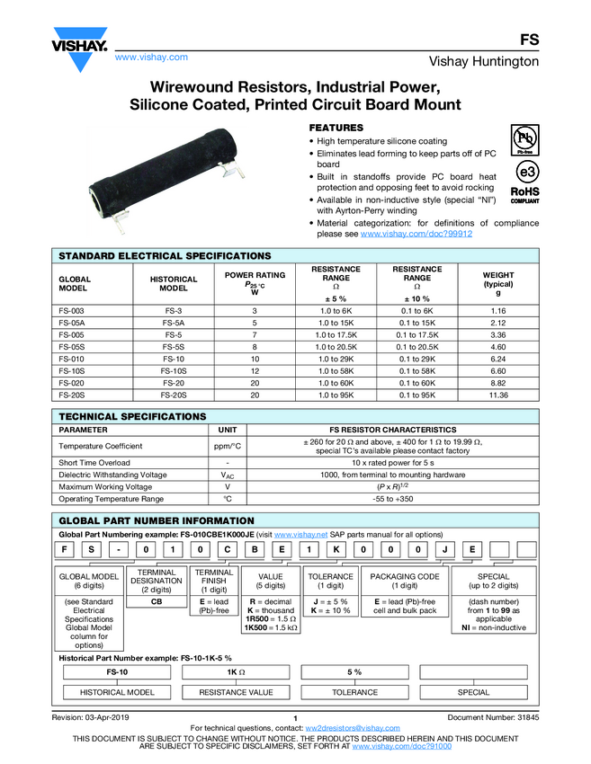 Wirewound Resistors, Industrial Power, Silicone Coated, Printed Circuit Board Mount