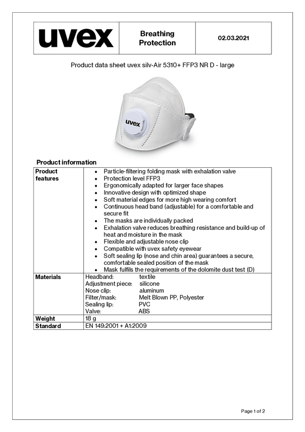 uvex silv-Air 5310+ 8735311 Maska przeciwpyłowa z wywietrznikiem FFP3 15 szt. EN 149:2001 + A1:2009 DIN 149:2001 + A1:20