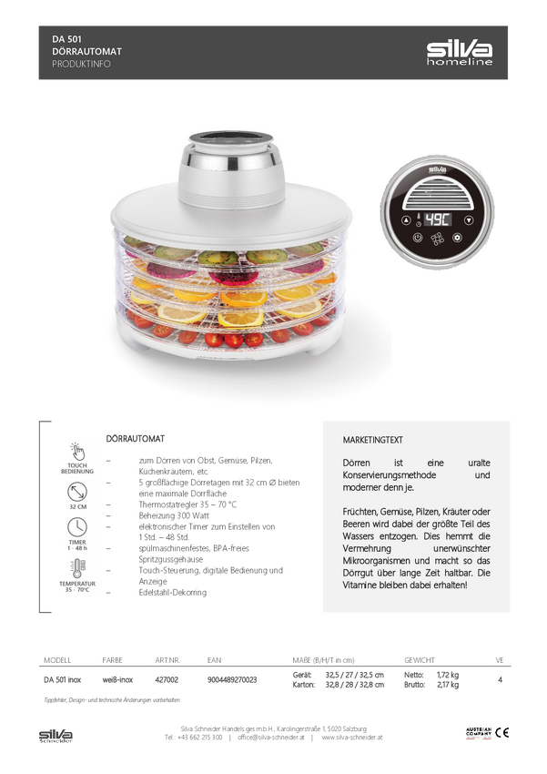 Silva Homeline DA 501 INOX 427002 Suszarka do grzybów i owoców biały, inox