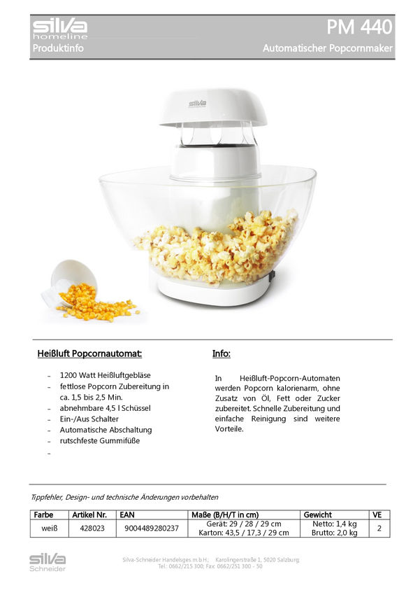 Silva Homeline PM 440 428023 Maszyna do Popcornu biały