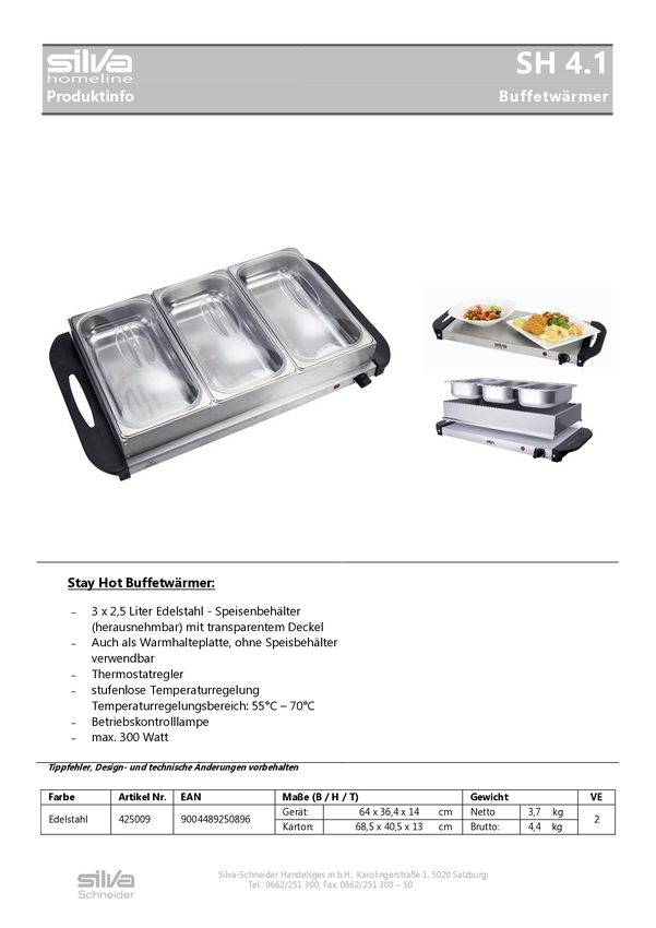 Silva Homeline SH 4.1 425009 Podgrzewacz bufetowy stali szlachetnej, czarny