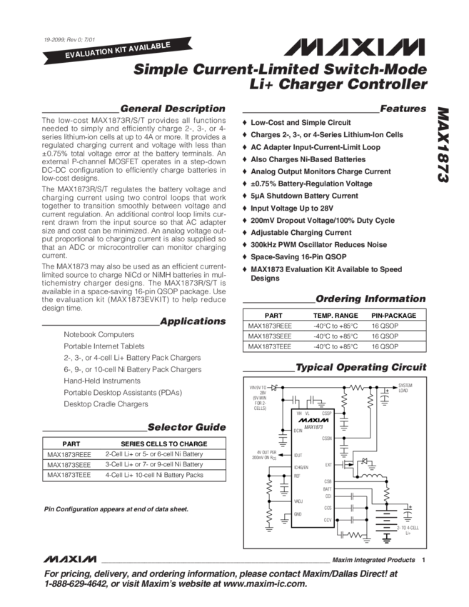 MAX1873 Simple Current-Limited Switch-Mode Li+ Charger Controller