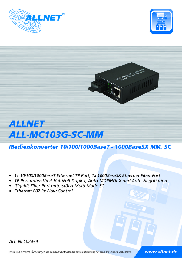 Allnet ALL-MC103G-SC-MM LAN, SC Simplex Konwerter multimediów, sieciowy 1 GBit/s