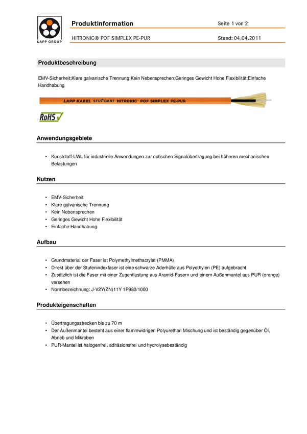 LAPP 28020001/1 Kabel POF Hitronic POF 980/1000 µ Simplex pomarańczowy Produkty w metrach bieżących