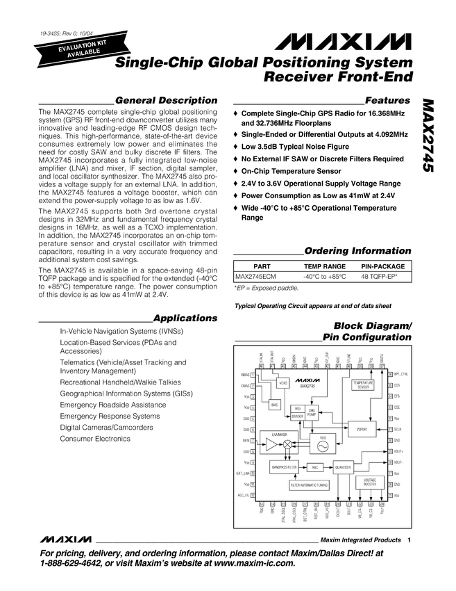 MAX2745 Single-Chip Global Positioning System Front-End Downconverter