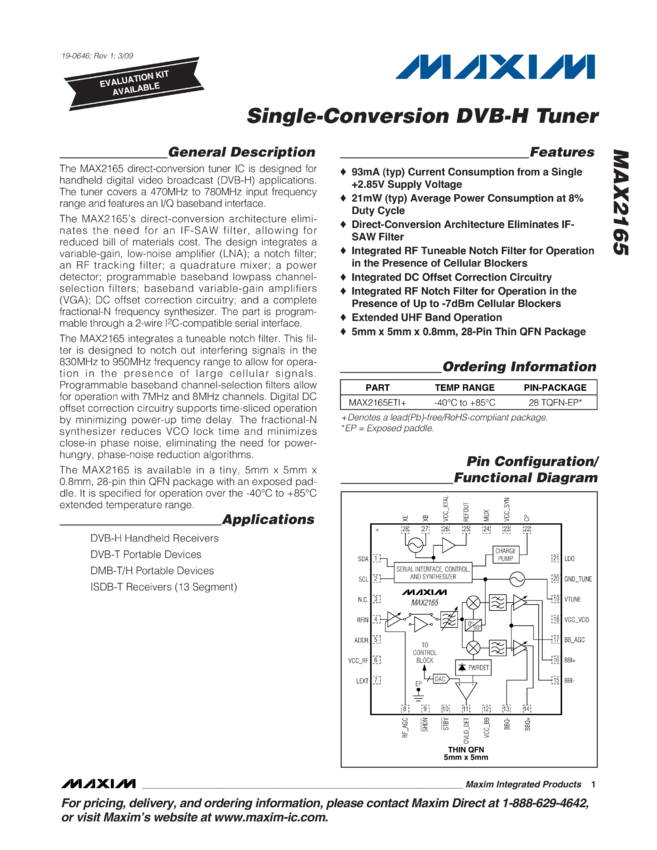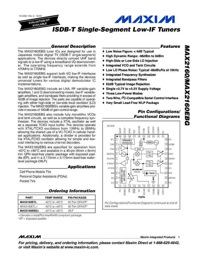 MAX2160, MAX2160EBG ISDB-T Single-Segment Low-IF Tuners