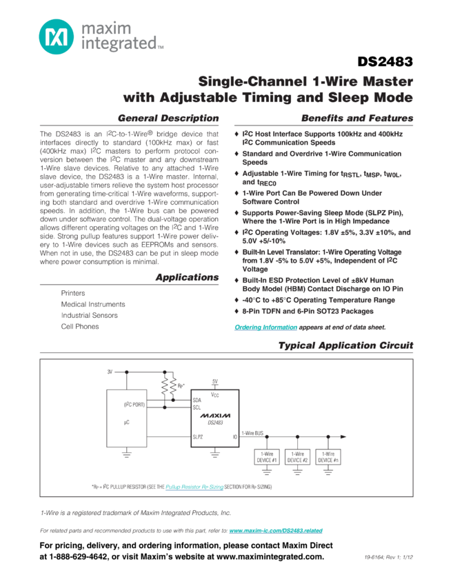 DS2483 Single-Channel 1-Wire Master with Adjustable Timing and Sleep Mode