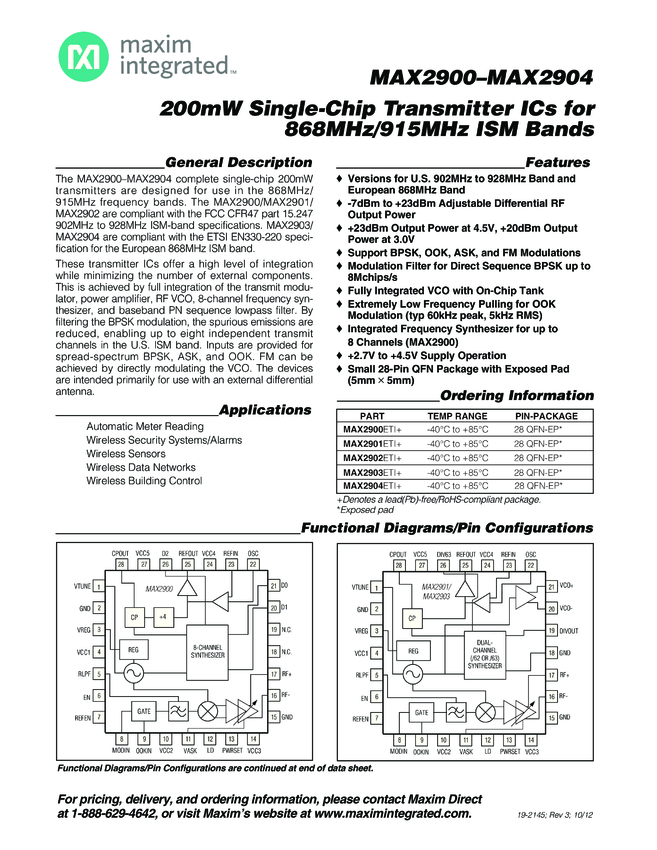 MAX2900, MAX2901, MAX2902, MAX2903, MAX2904 200mW Single-Chip Transmitter ICs for 868MHz/915MHz ISM Bands